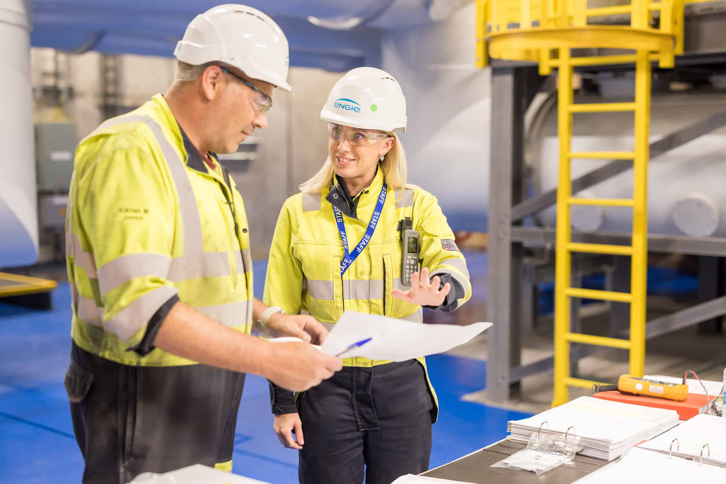Two ENGIE employees looking at paper in PPE