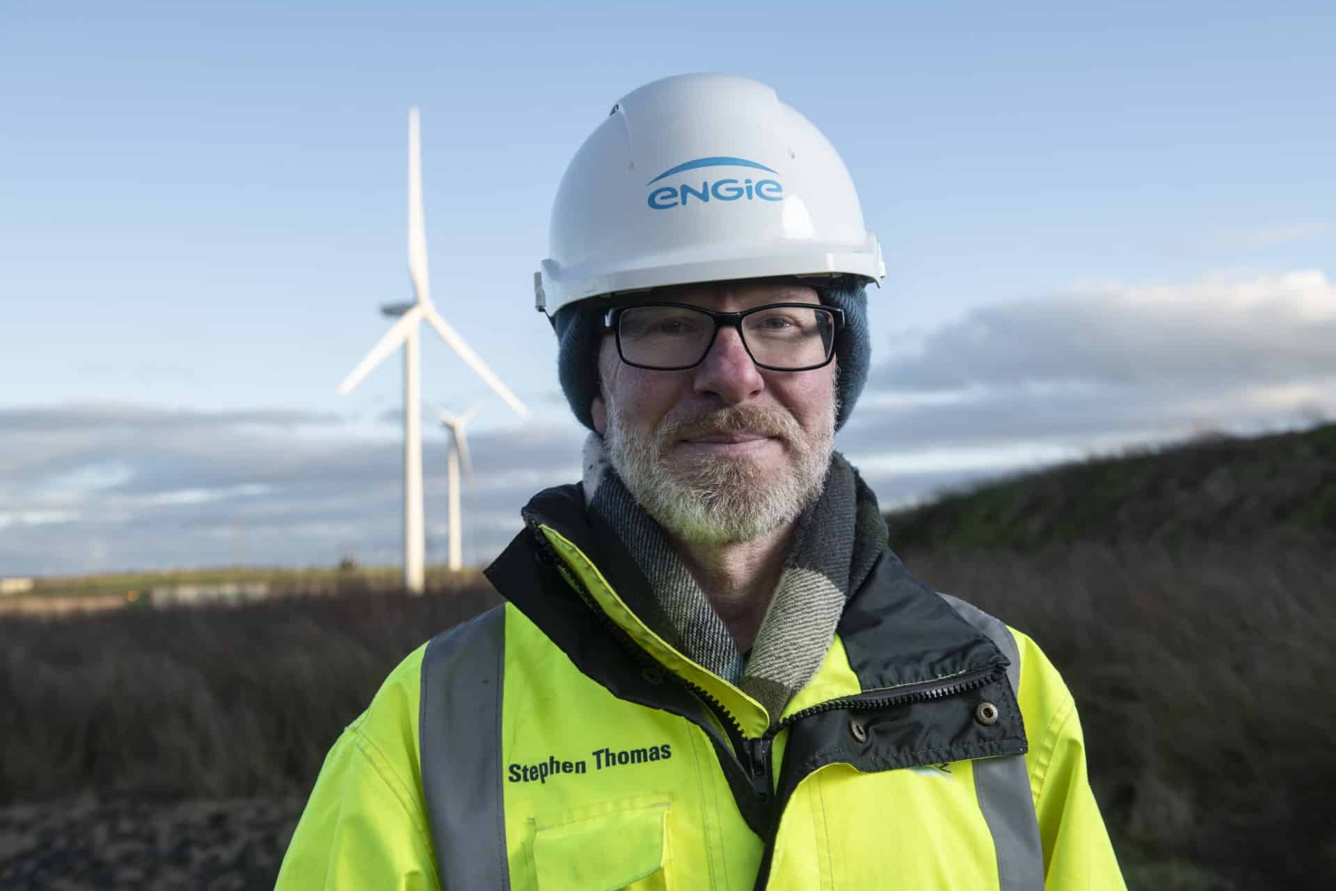 Man standing in front of ENGIE wind turbine