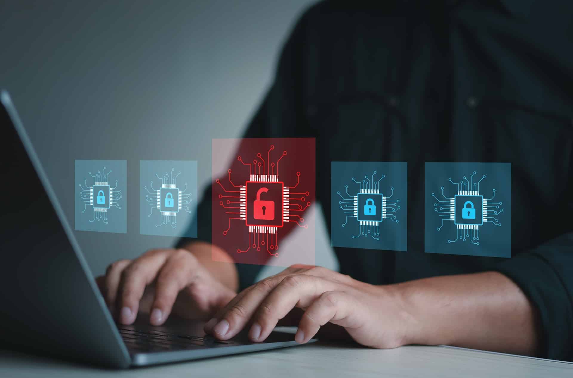 Cyber ​​security risk and data breach concept. Businessman using laptop with digital key icon. Red key open symbol of data breach. Cyber ​​security.